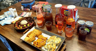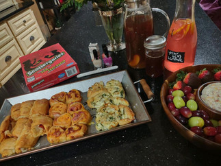 Now to start off my aunt cannot eat or drink anything, so she had to suffer through watching us take in all these goods, but me my sister and my mom did make sure to eat enough for her as well. 😉 We had chocolate covered strawberries, grapes, a bacon ranch cheeseball with crackers, spinach artichoke pinwheels, pizza bites, ham & turkey pinwheels, homemade peach tea & strawberry lemonade, Non-Alcoholic Strawberry Daiquiris, Shirley Temples, & Tortugas. The mocktails were so pretty you would have never known there was no alcohol in them. 😁